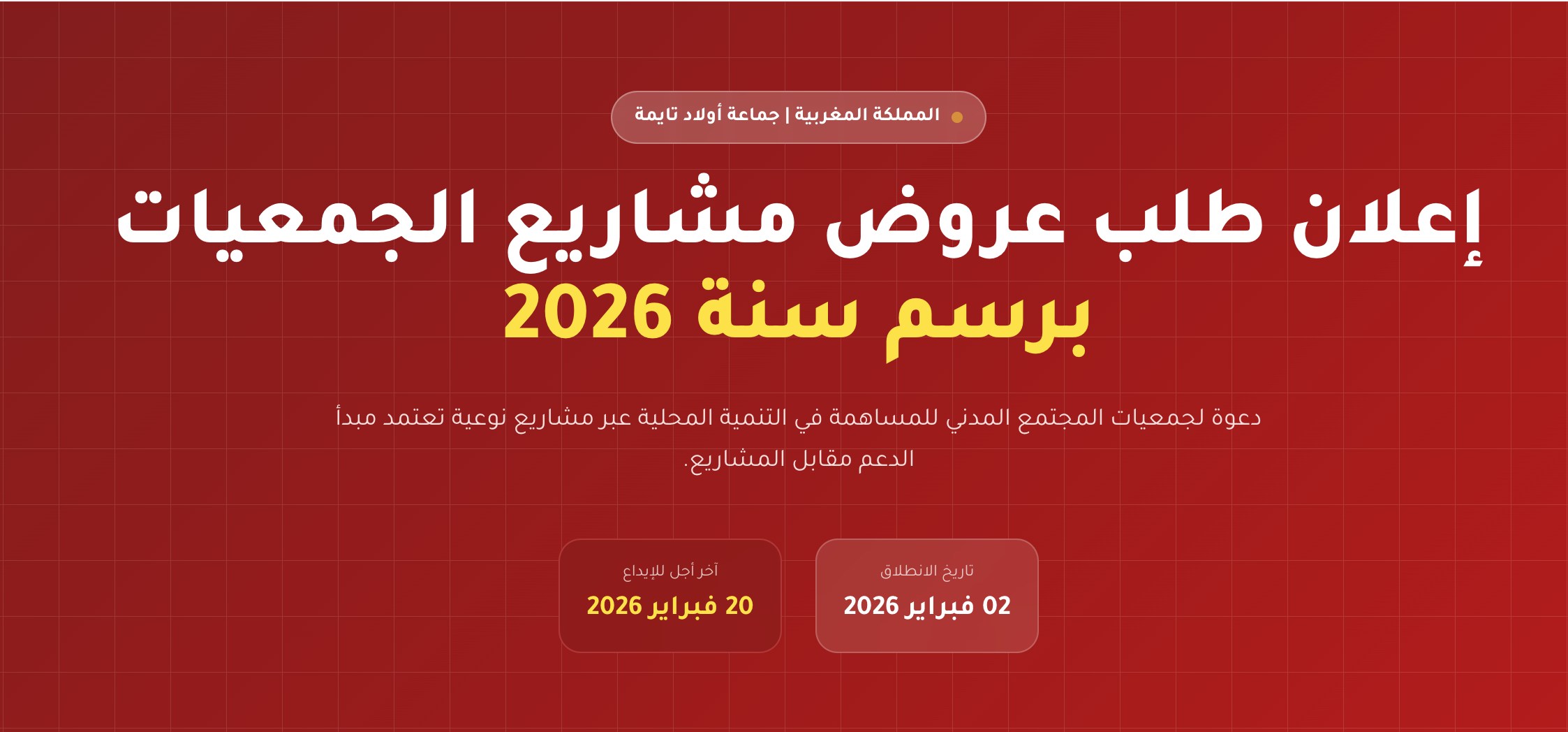 تعلن رئيسة المجلس الجماعي لأولاد تايمة إلى عموم الجمعيات المدنية أنه سيشرع في تلقي طلبات دعم مشاريع الجمعيات برسم سنة 2026، ابتداء من تاريخ 2 فبراير 2026 الى غاية يوم 20 فبراير 2026 على الساعة الرابعة والنصف زوالا بمكتب الضبط بالجماعة.